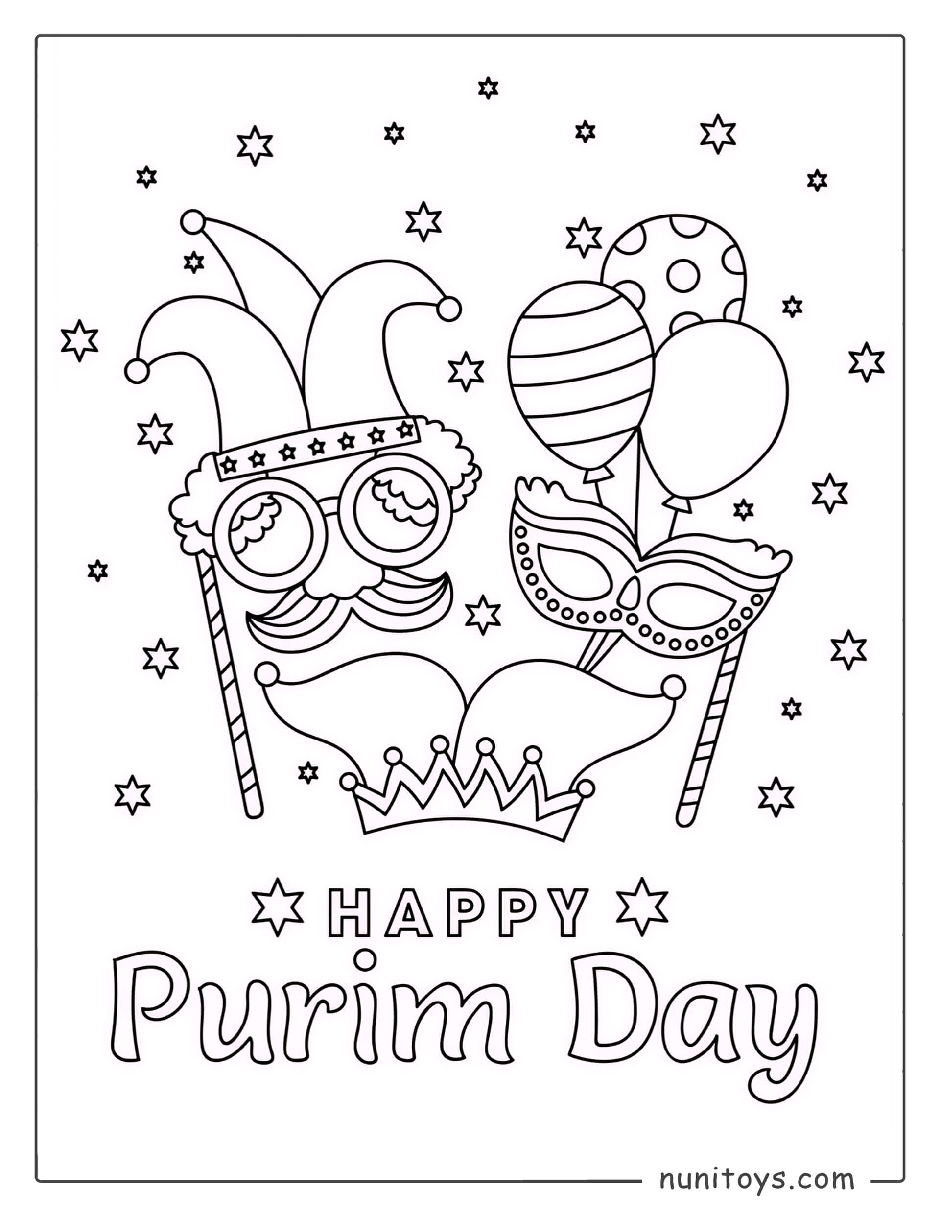 اختر التصميم المفضل، حمّله، واطبعه — ودع الأطفال يستمتعون بوقت تلوين احتفالي يعكس روح عيد بوريم.