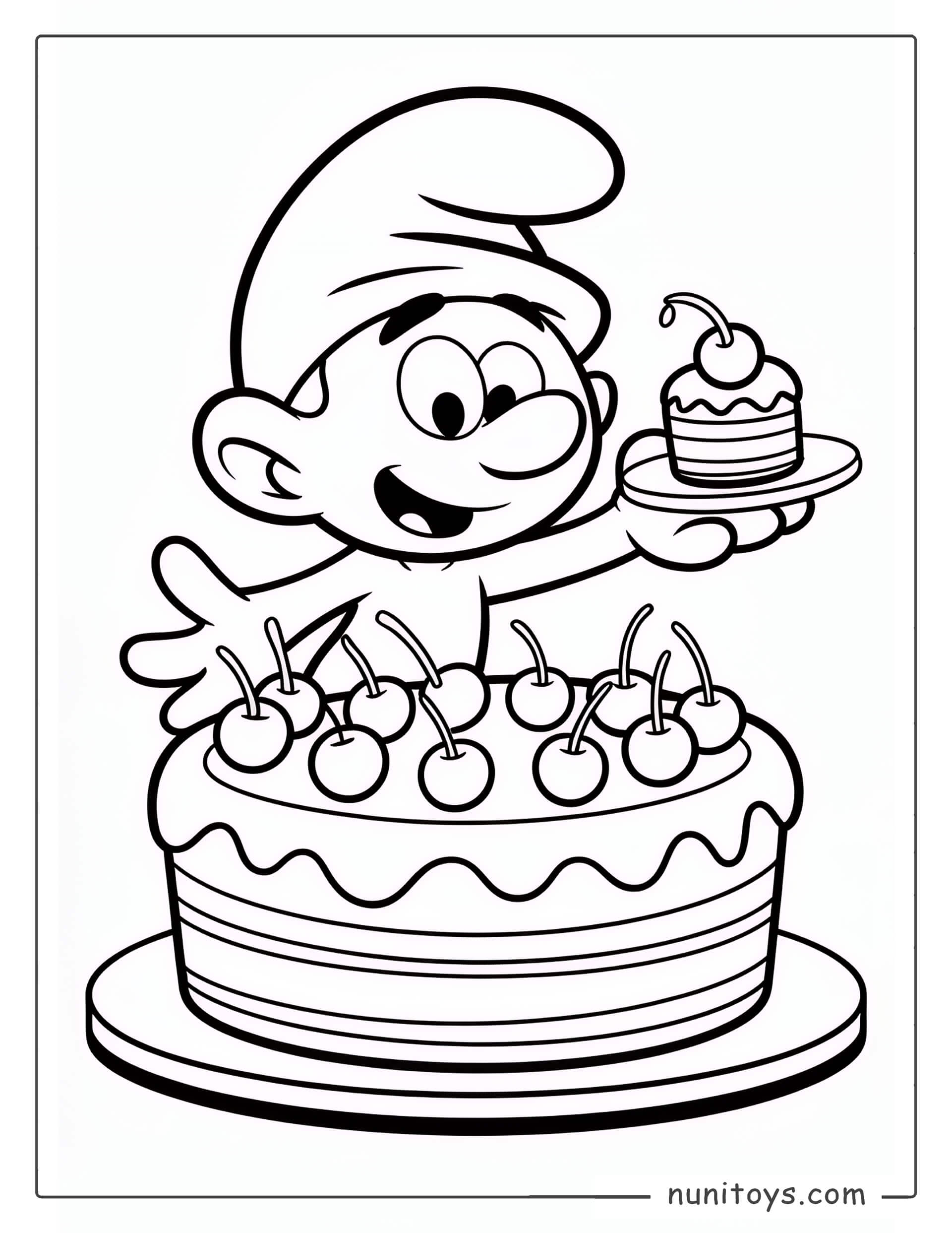 صفحة تلوين سنفور مع كعكة عيد ميلاد