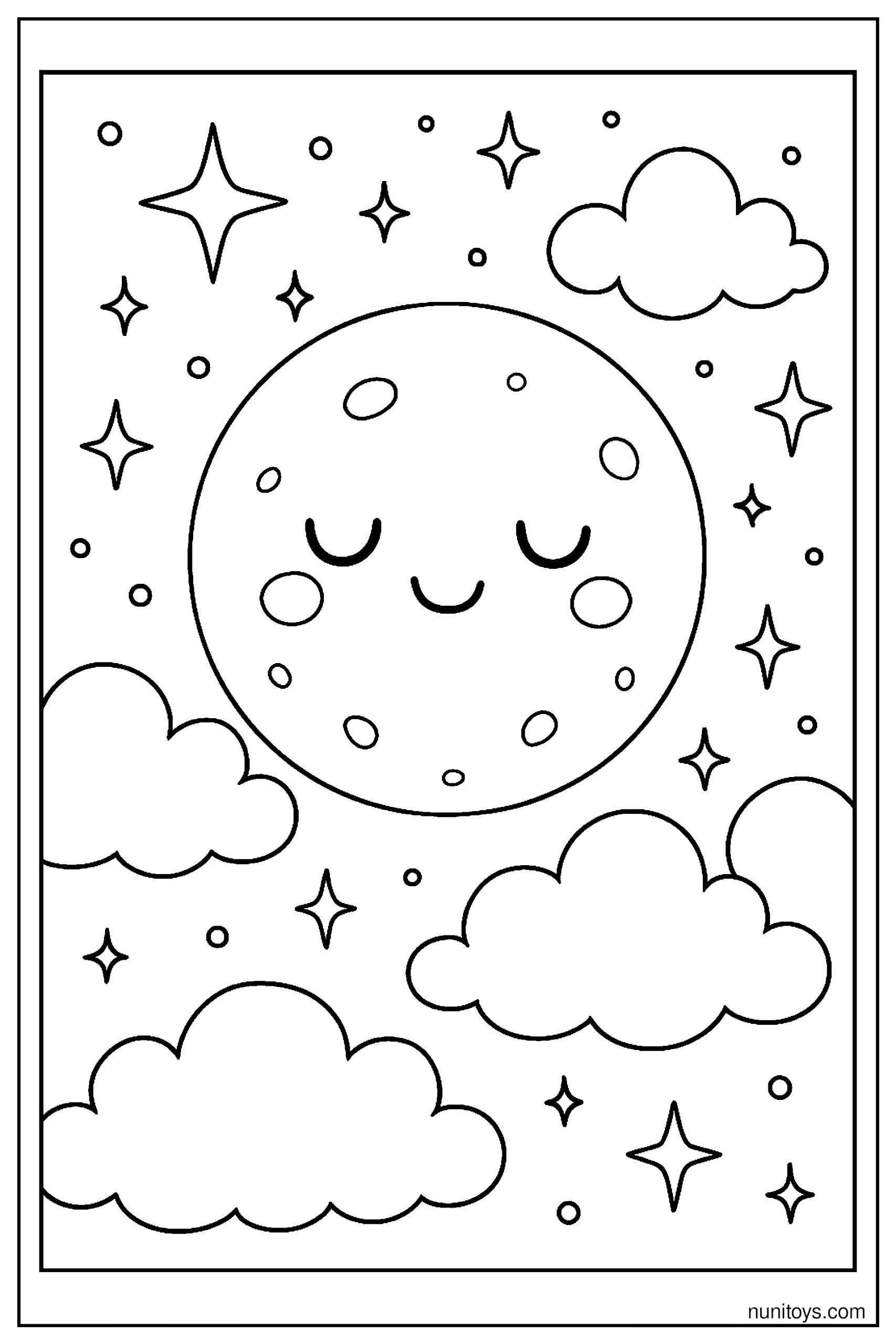 Our collection features a variety of styles, from cute smiling moons for toddlers to more detailed and dreamy moon scenes for older children and adults. You’ll find the moon surrounded by stars, clouds, night skies, and even fantasy elements like sleeping animals or whimsical landscapes.