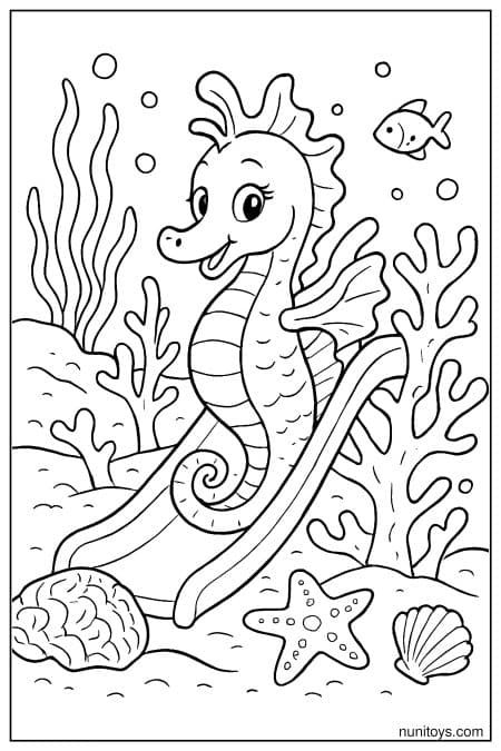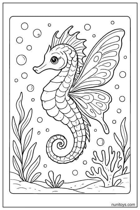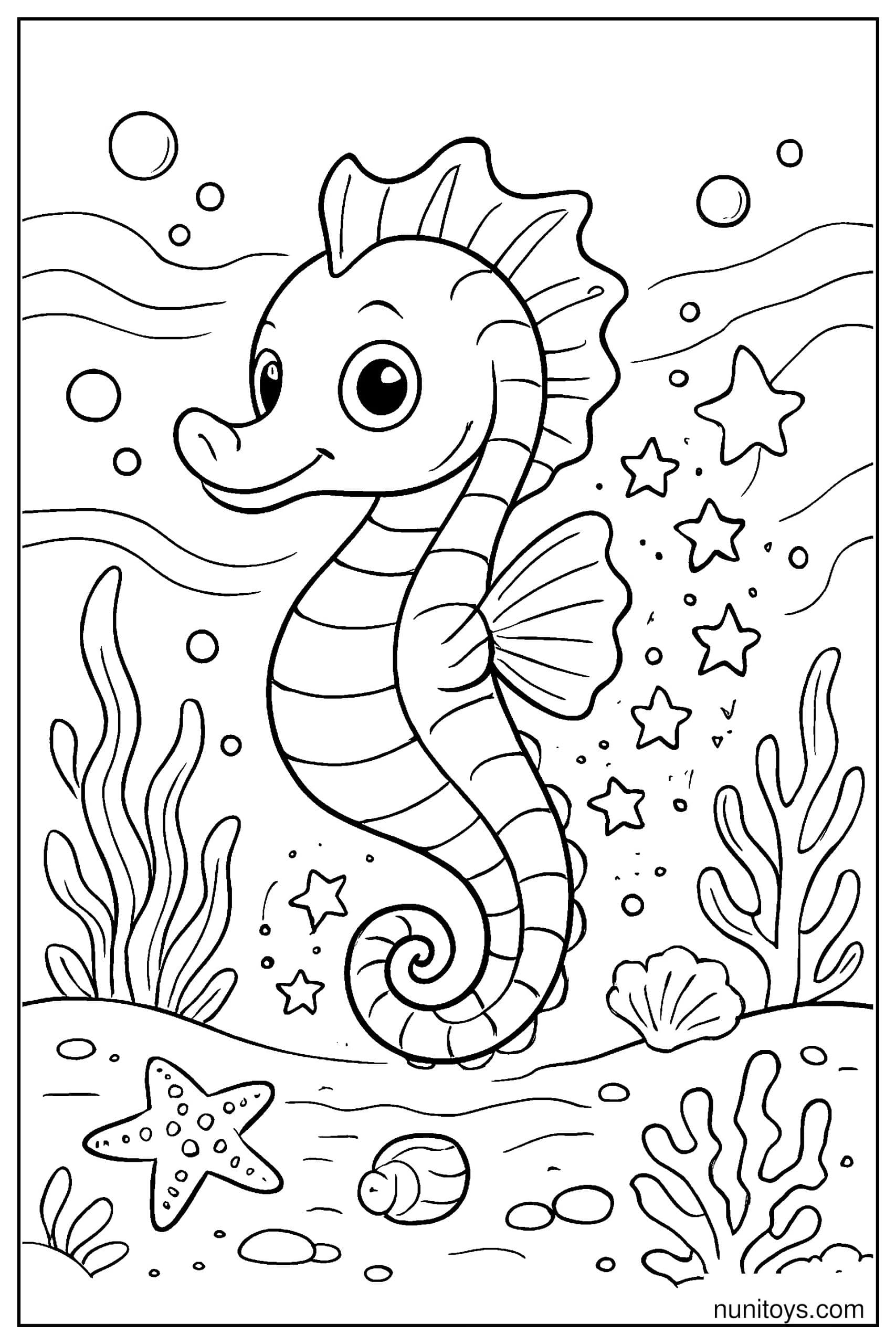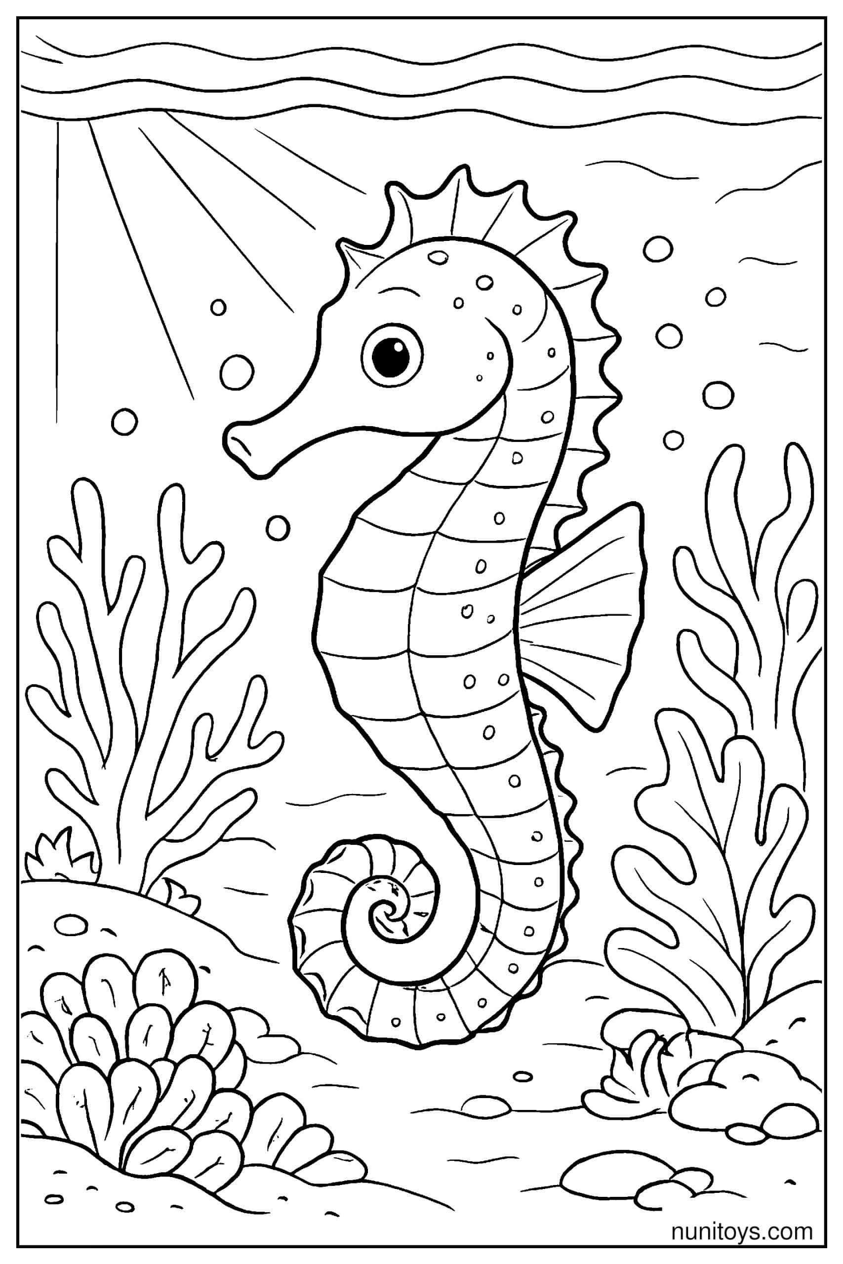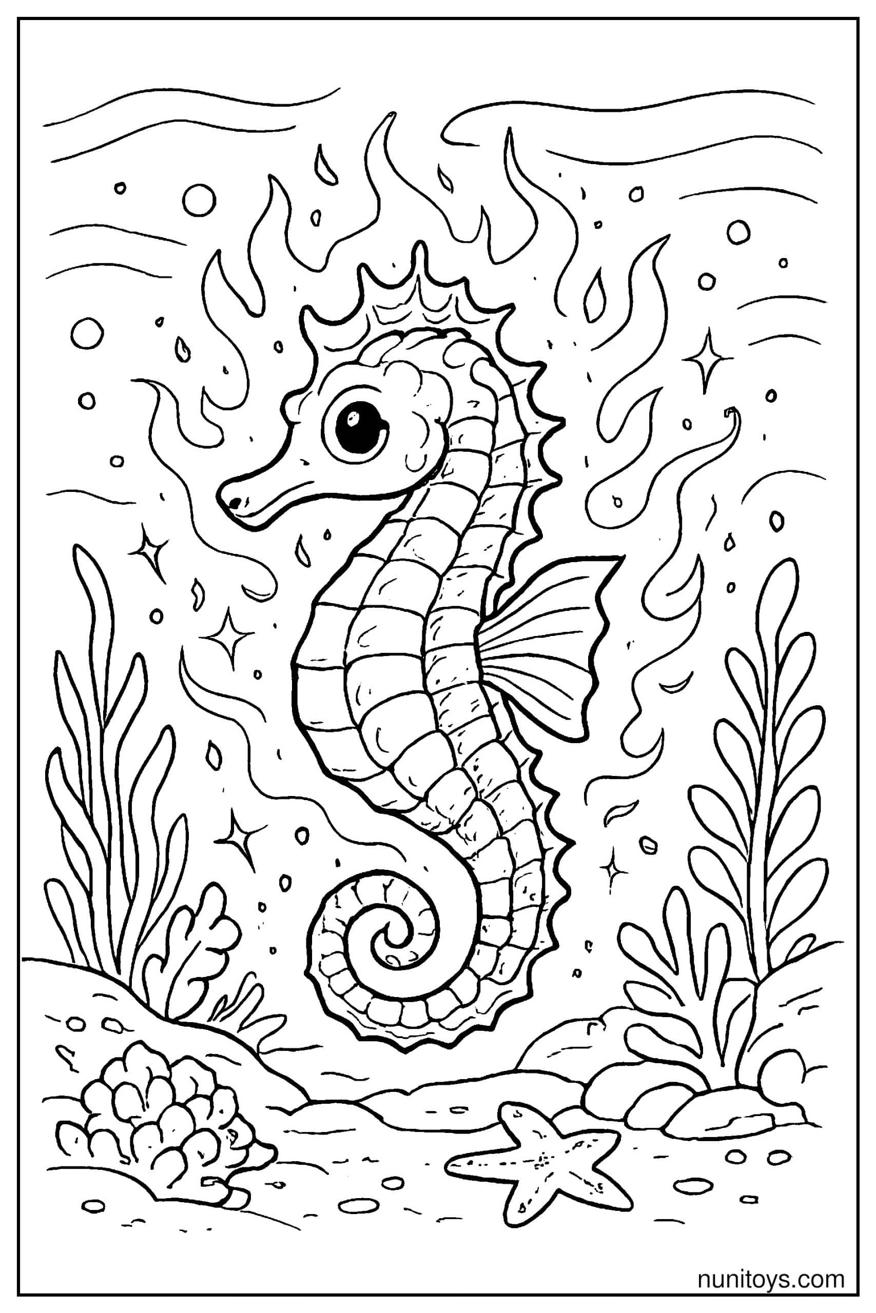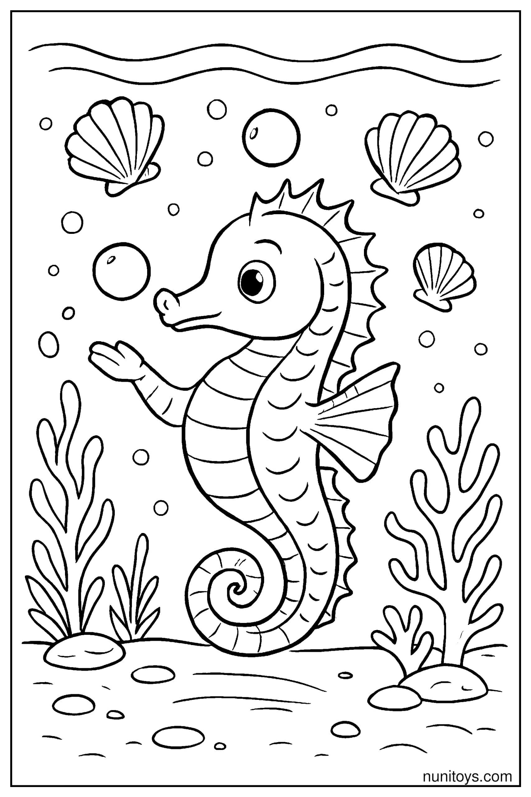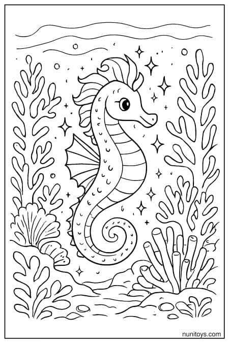 You’ll find a wide range of styles, from cute cartoon seahorses floating among bubbles and coral reefs to more intricate mandala-inspired designs filled with seashells, sea plants, and flowing wave textures. Some illustrations capture peaceful underwater gardens with soft light filtering through the water, while others feature playful seahorses interacting with fish, starfish, and vibrant coral environments. Whether you prefer simple outlines for kids or more detailed artwork for older users, there’s something for everyone.