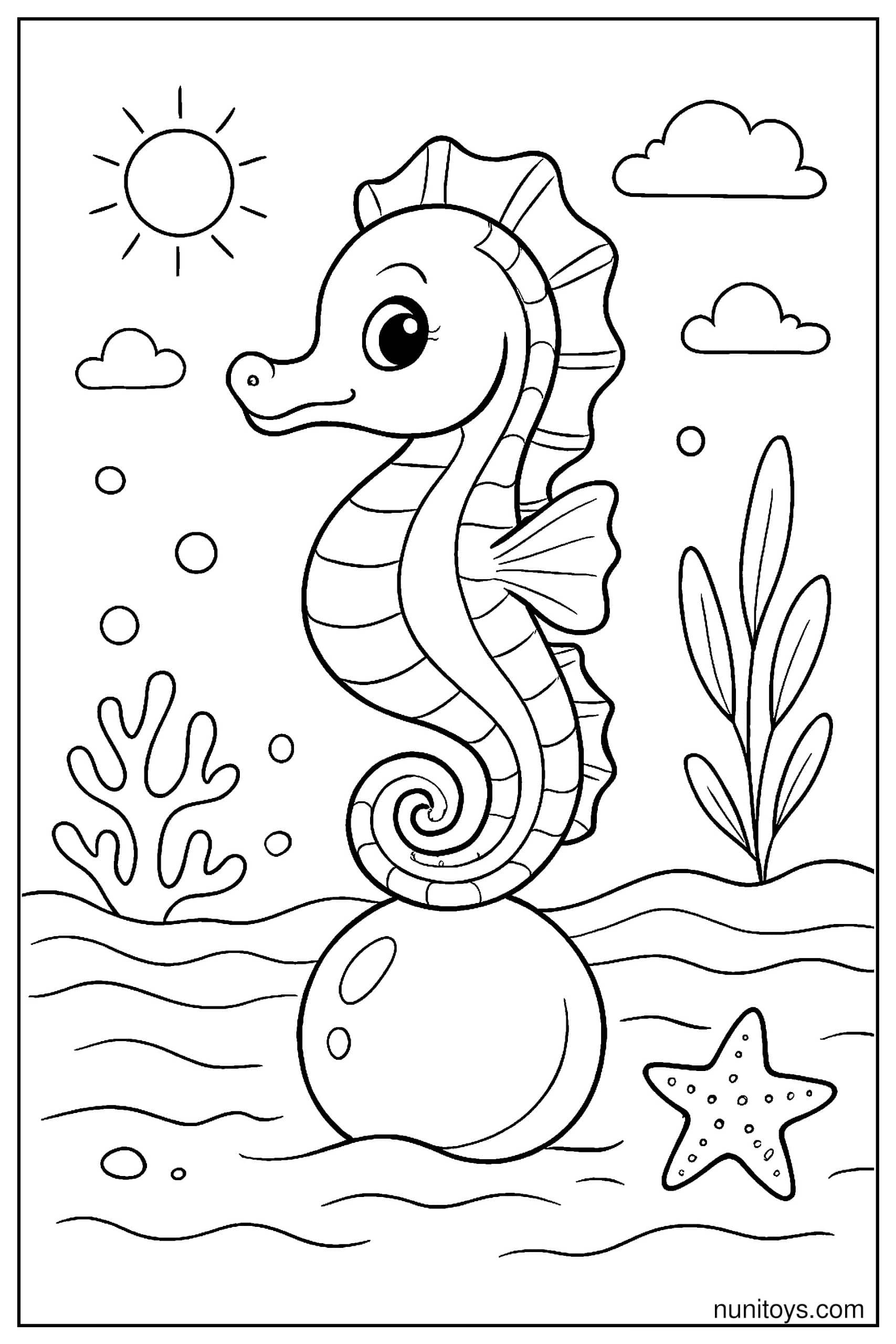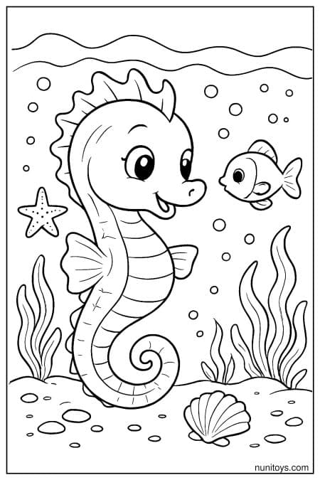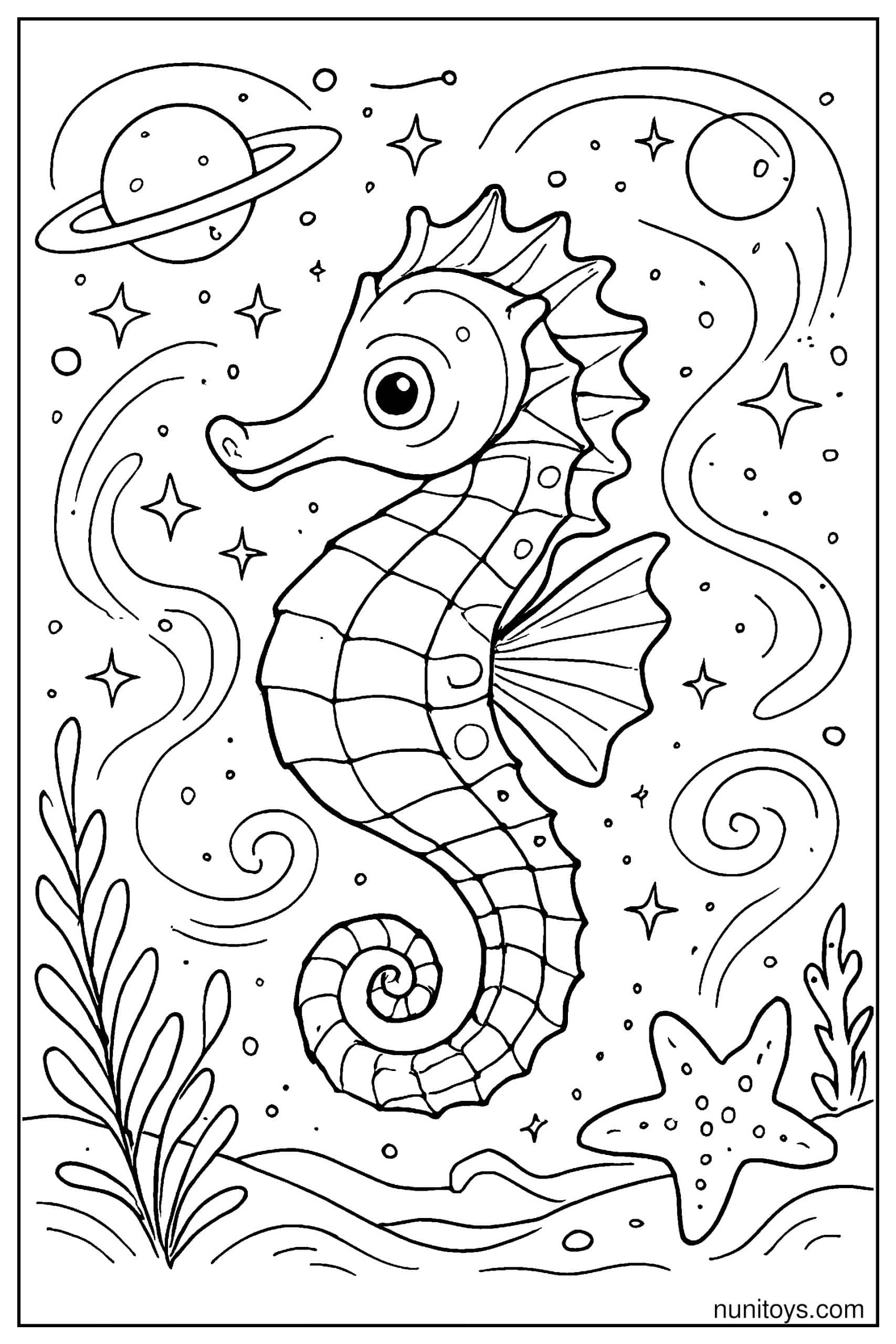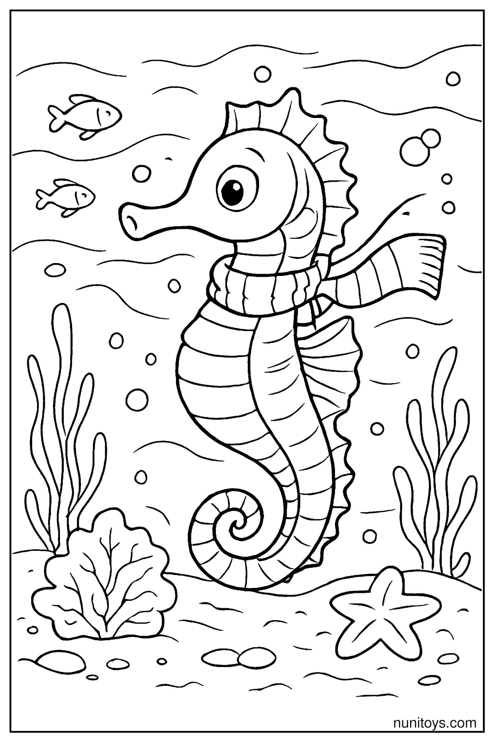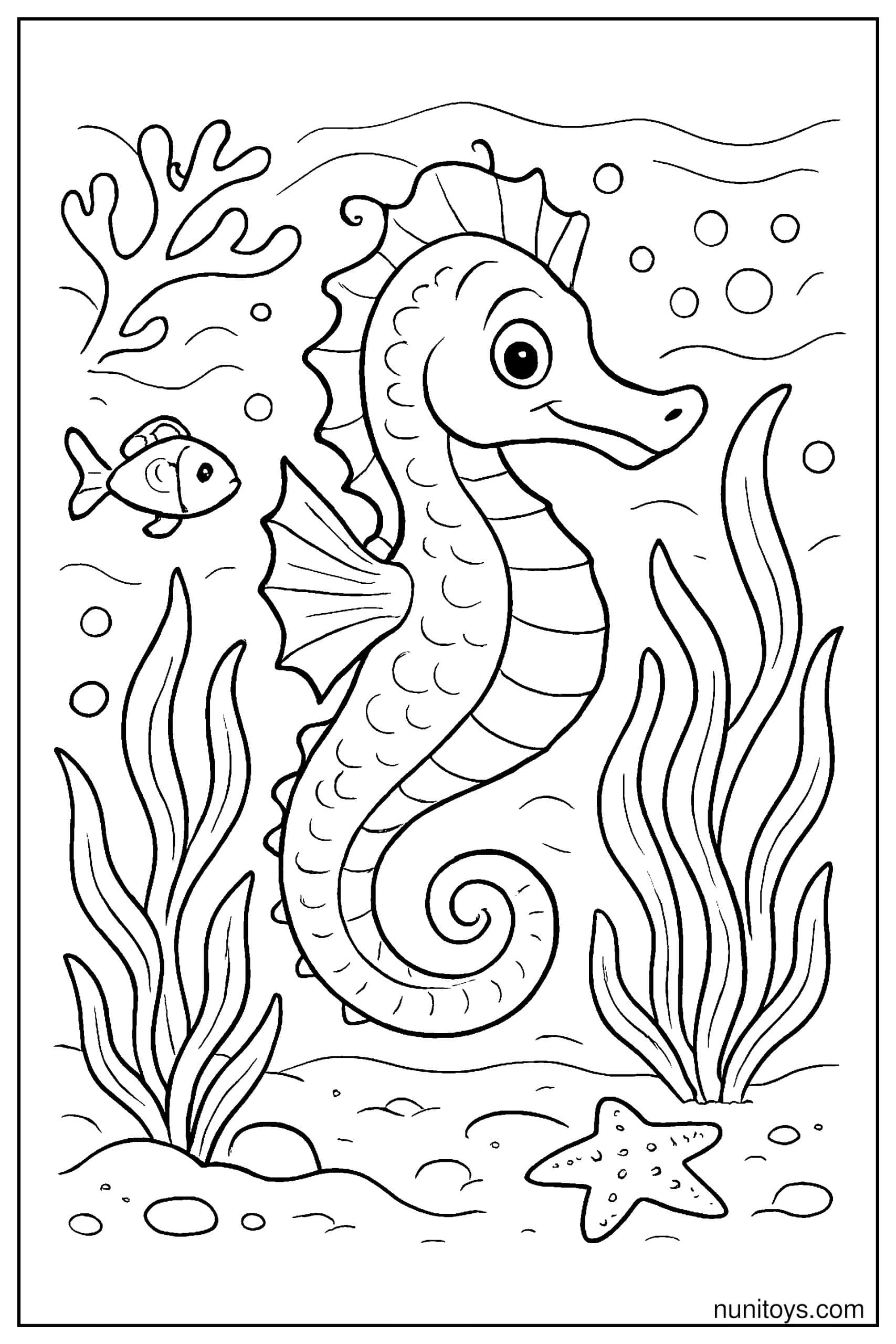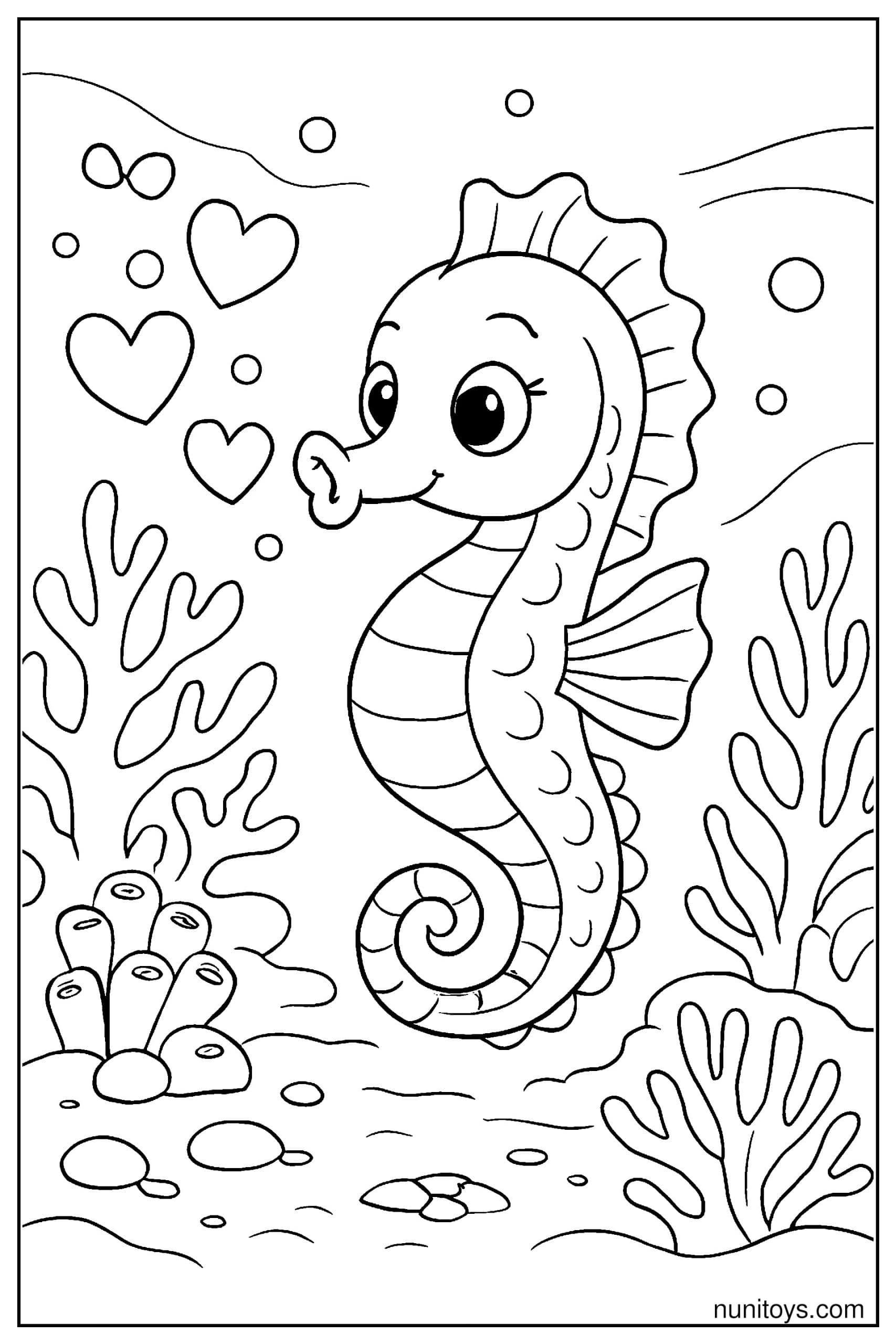 You’ll find a wide range of styles, from cute cartoon seahorses floating among bubbles and coral reefs to more intricate mandala-inspired designs filled with seashells, sea plants, and flowing wave textures. Some illustrations capture peaceful underwater gardens with soft light filtering through the water, while others feature playful seahorses interacting with fish, starfish, and vibrant coral environments. Whether you prefer simple outlines for kids or more detailed artwork for older users, there’s something for everyone.