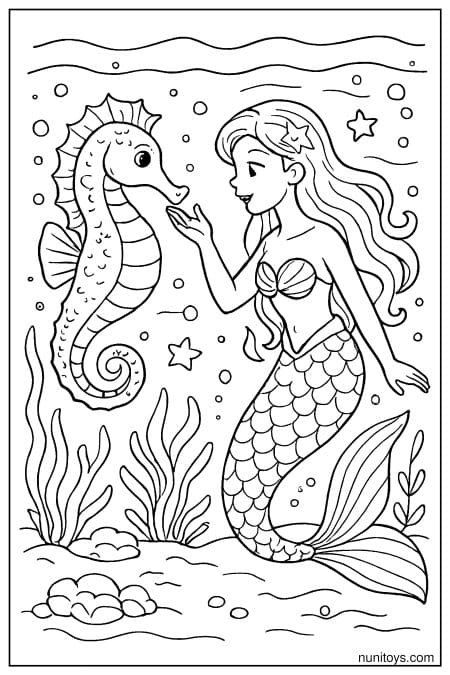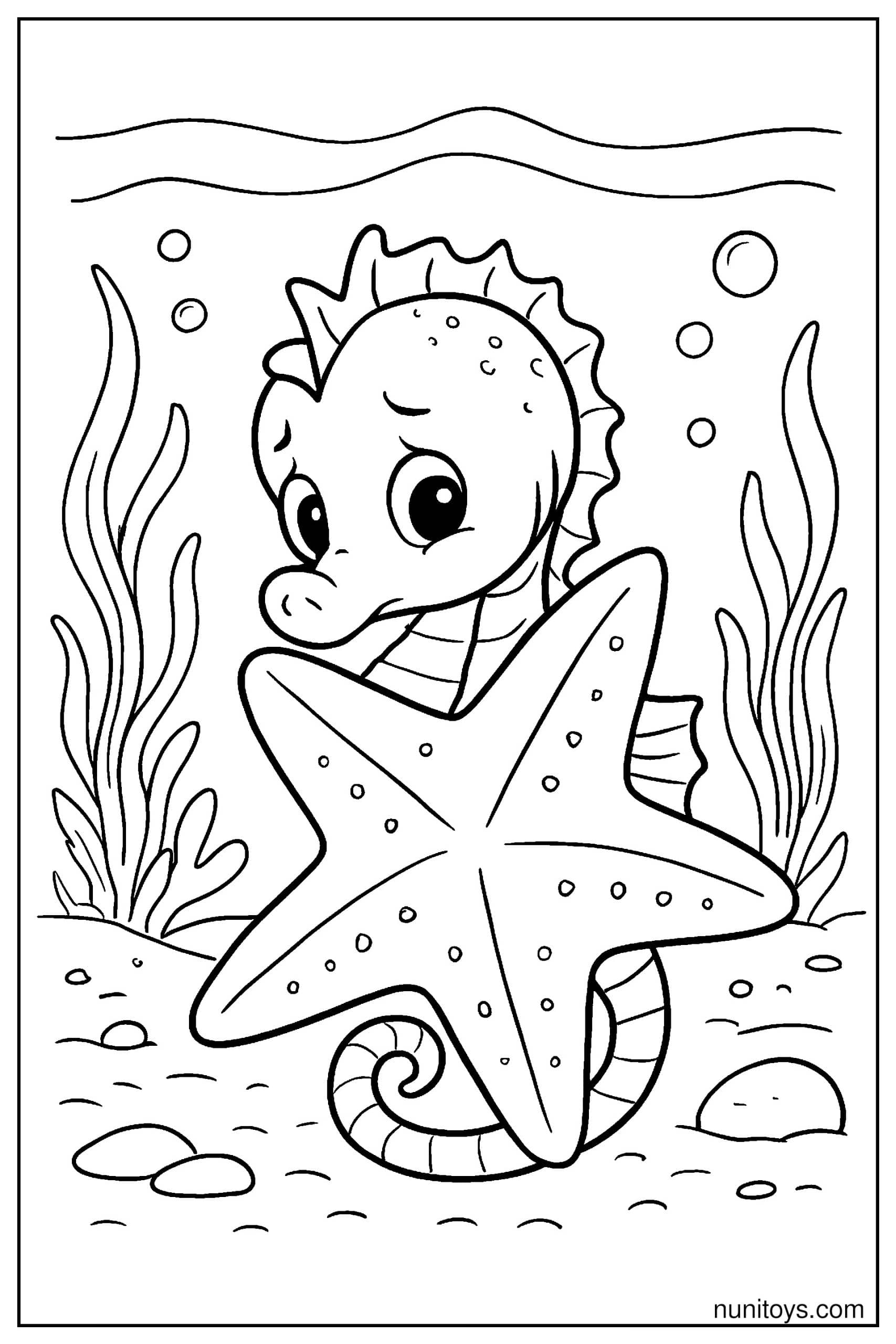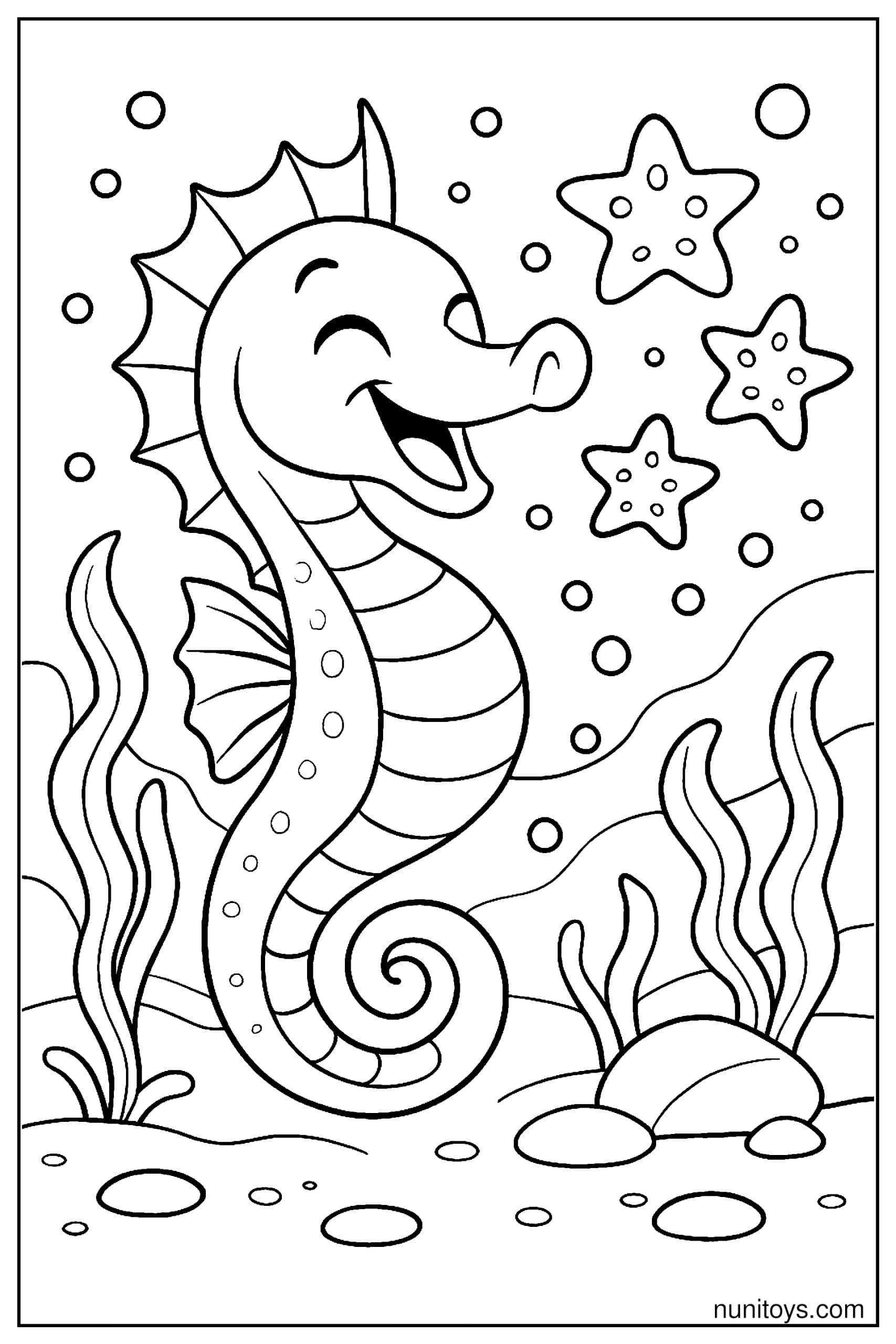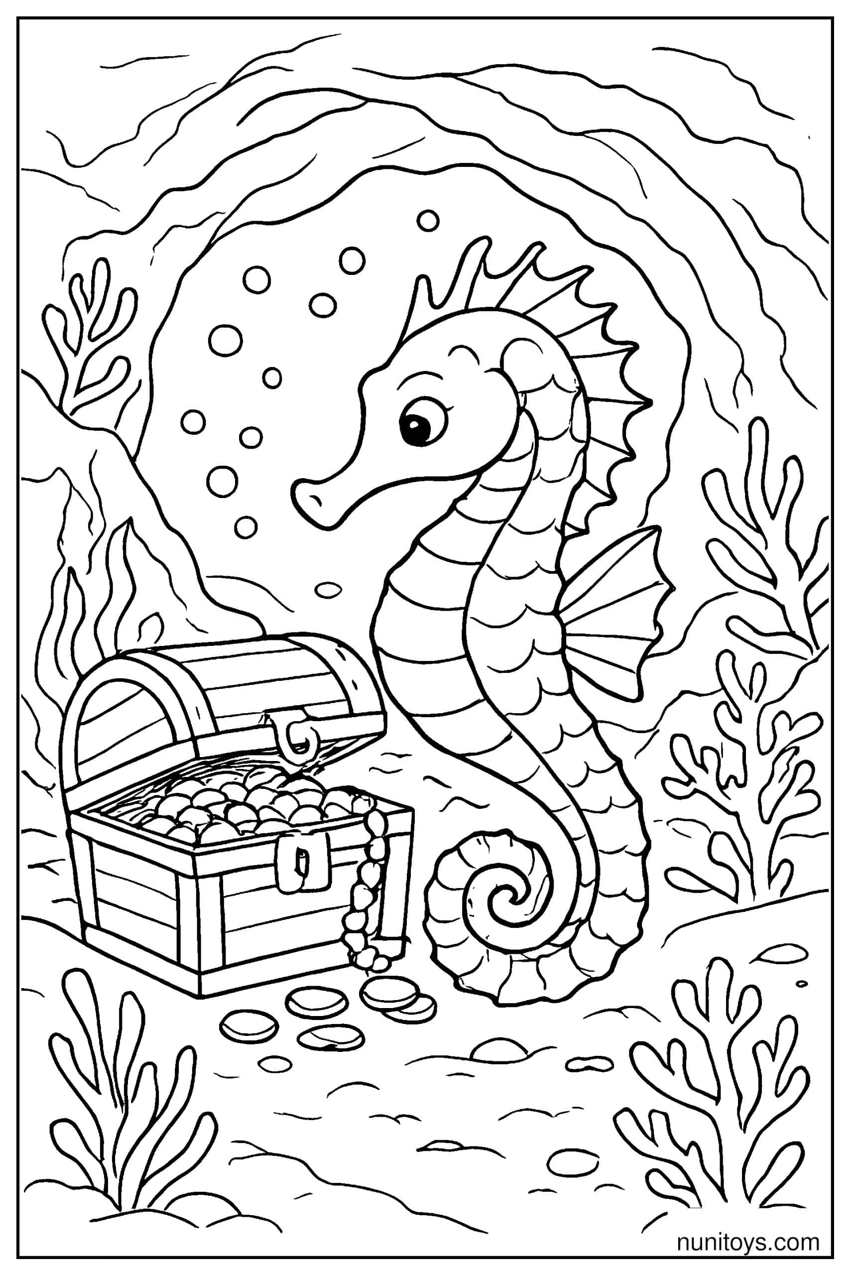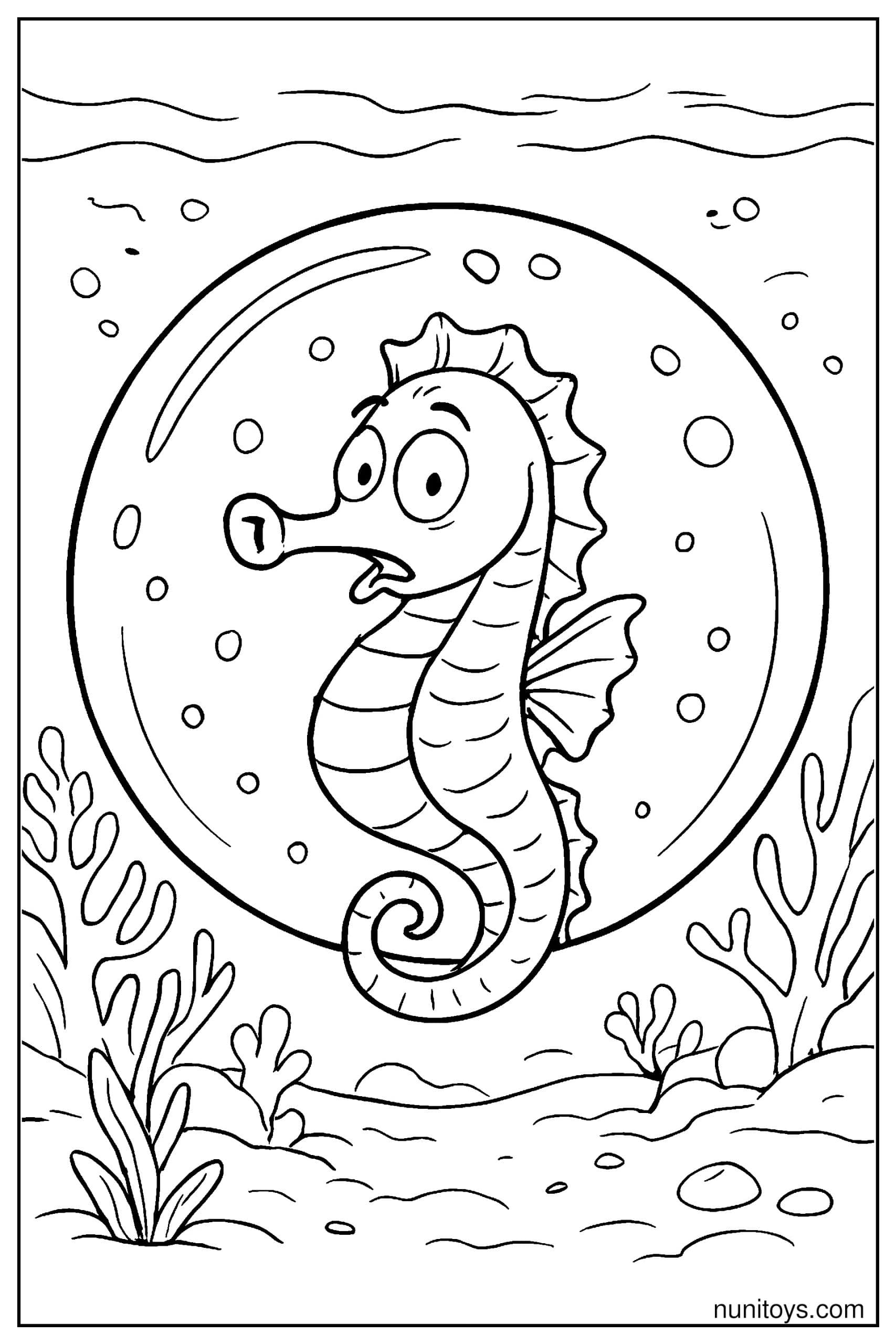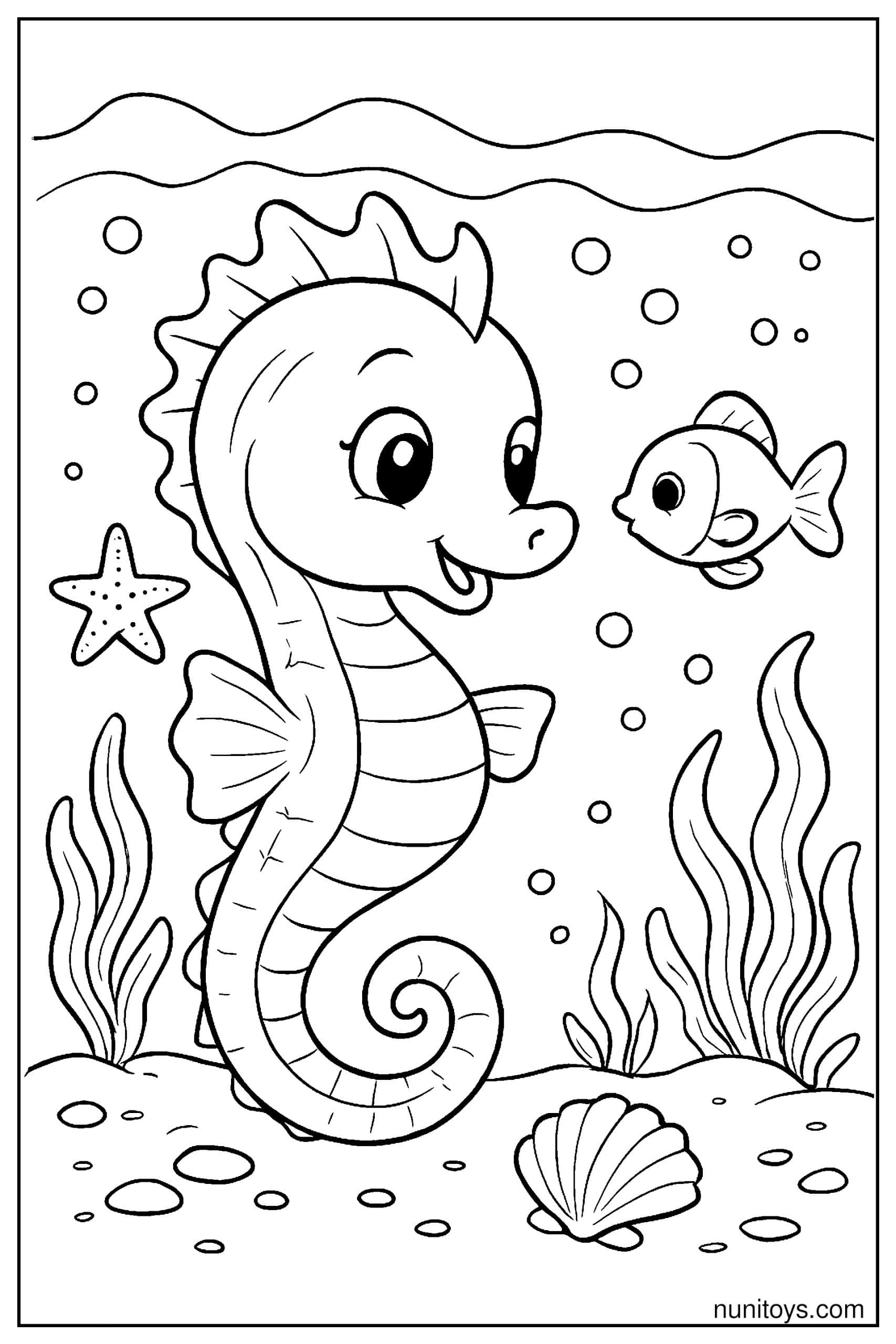 You’ll find a wide range of styles, from cute cartoon seahorses floating among bubbles and coral reefs to more intricate mandala-inspired designs filled with seashells, sea plants, and flowing wave textures. Some illustrations capture peaceful underwater gardens with soft light filtering through the water, while others feature playful seahorses interacting with fish, starfish, and vibrant coral environments. Whether you prefer simple outlines for kids or more detailed artwork for older users, there’s something for everyone.