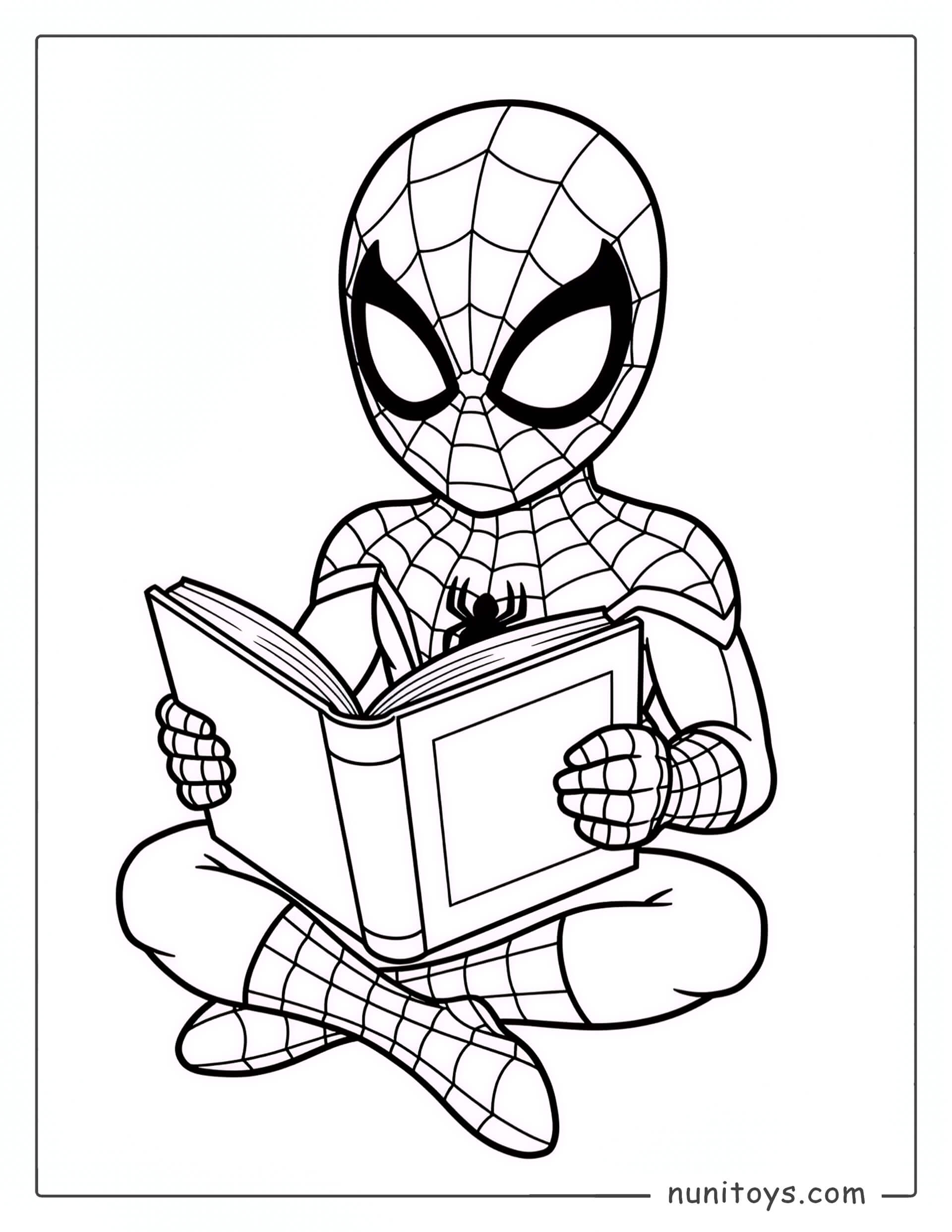 Spiderman sits cross-legged in this coloring page, holding an open book with both hands. His suit shows detailed web patterns across the mask, arms, and legs, with a spider emblem on his chest. The simple background keeps focus on the character, creating a clean printable scene offered free.
