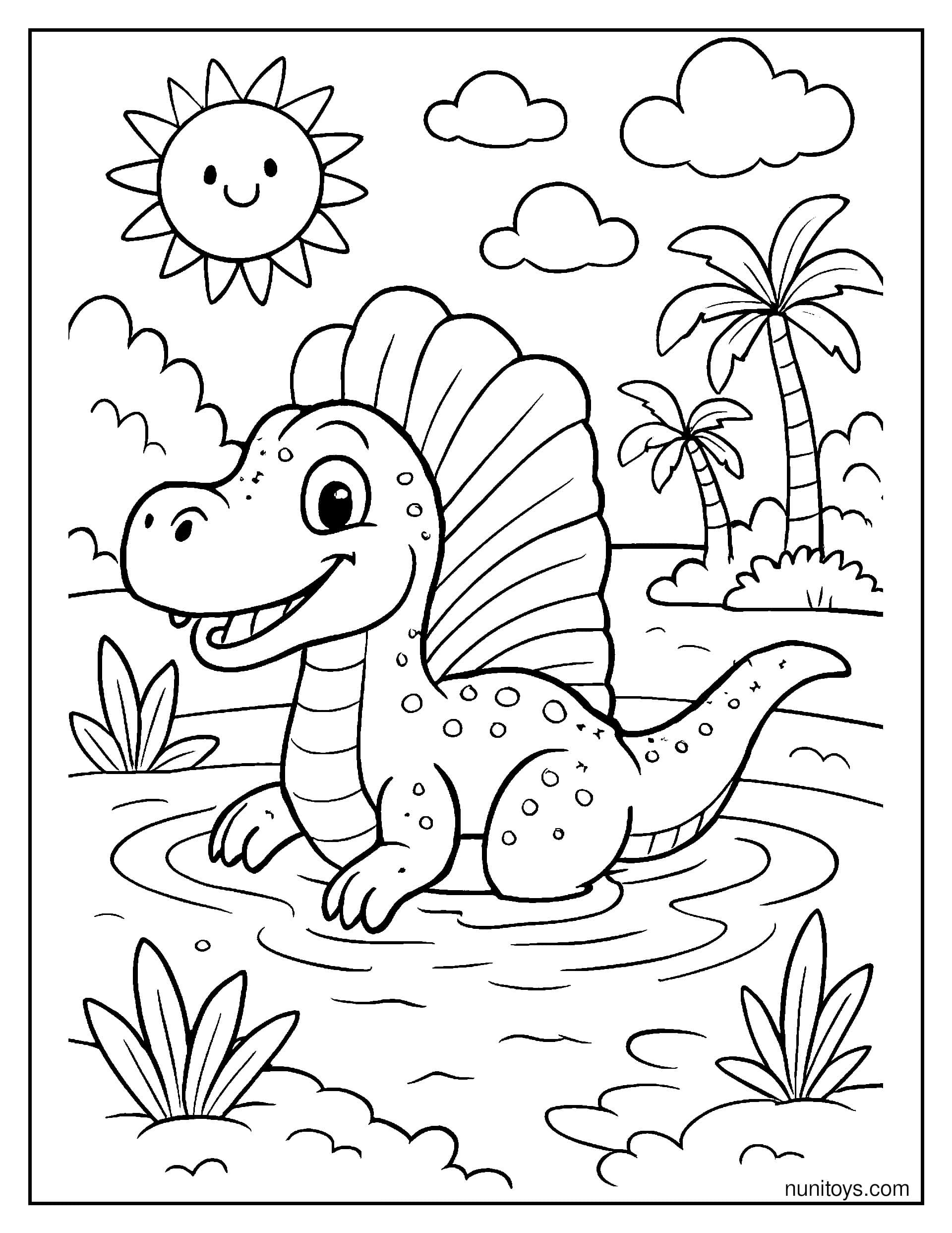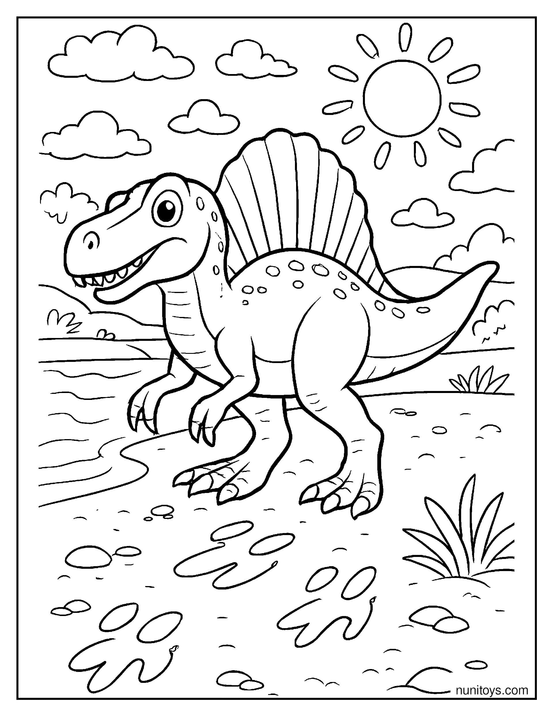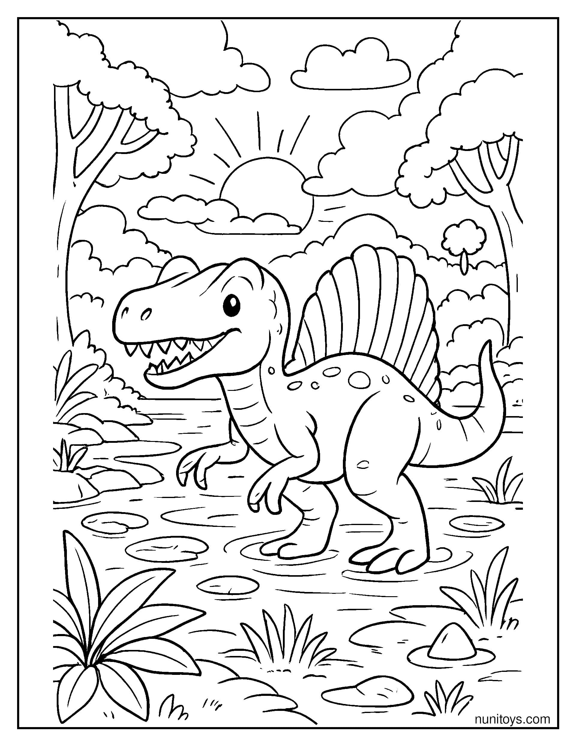 Known for its distinctive sail-like fin and semi-aquatic lifestyle, the Spinosaurus captures the imagination with its unusual appearance and connection to water environments. Many of these coloring pages include rivers, swamps, and ancient landscapes, bringing this fascinating dinosaur to life in dynamic and engaging settings.