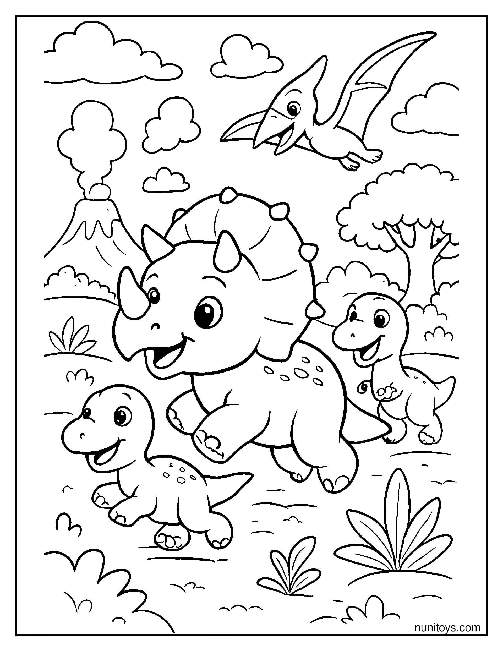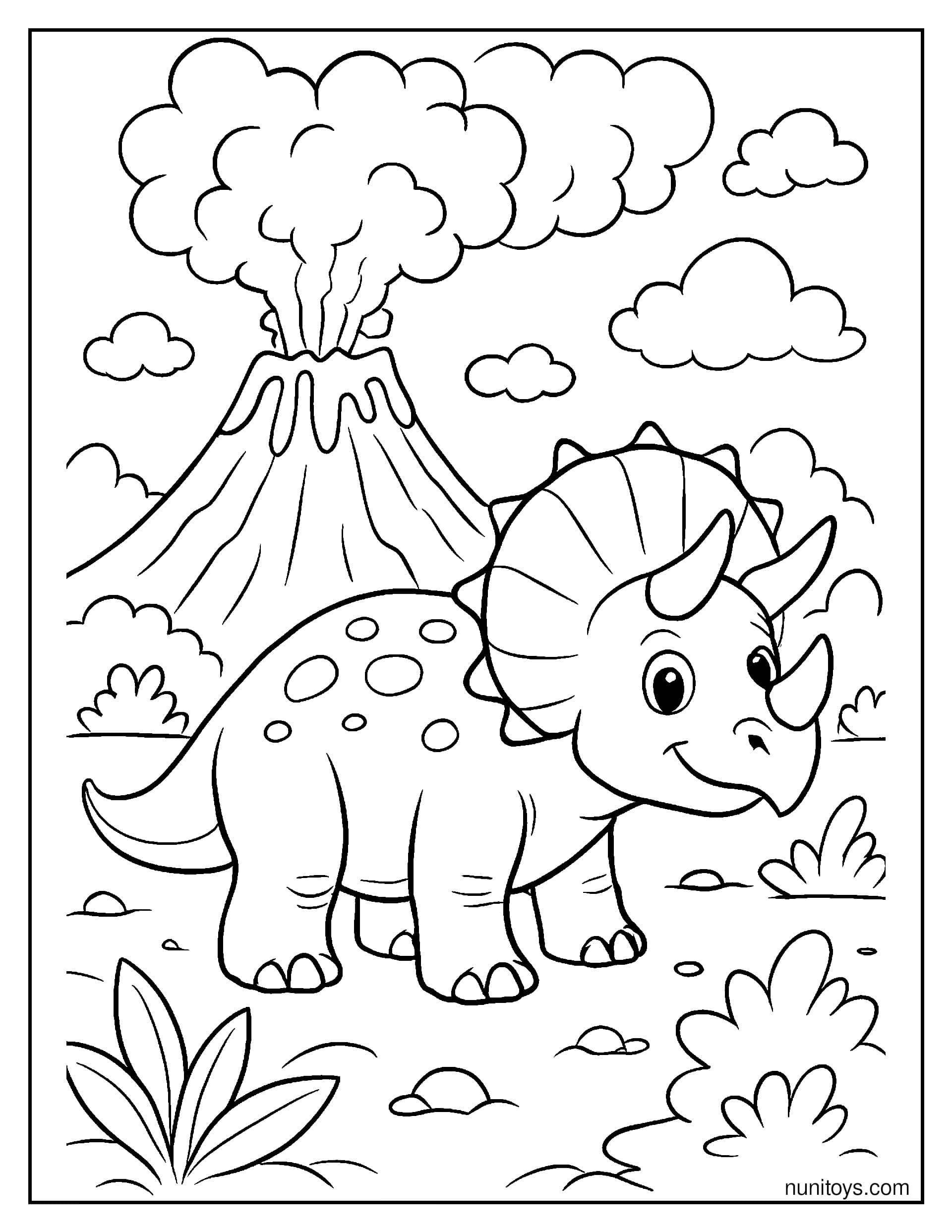 Coloring Triceratops pages helps develop fine motor skills, improve concentration, and spark imagination, all while providing a relaxing, screen-free activity. Many designs include prehistoric landscapes with volcanoes, plants, and other dinosaurs, bringing the ancient world to life.