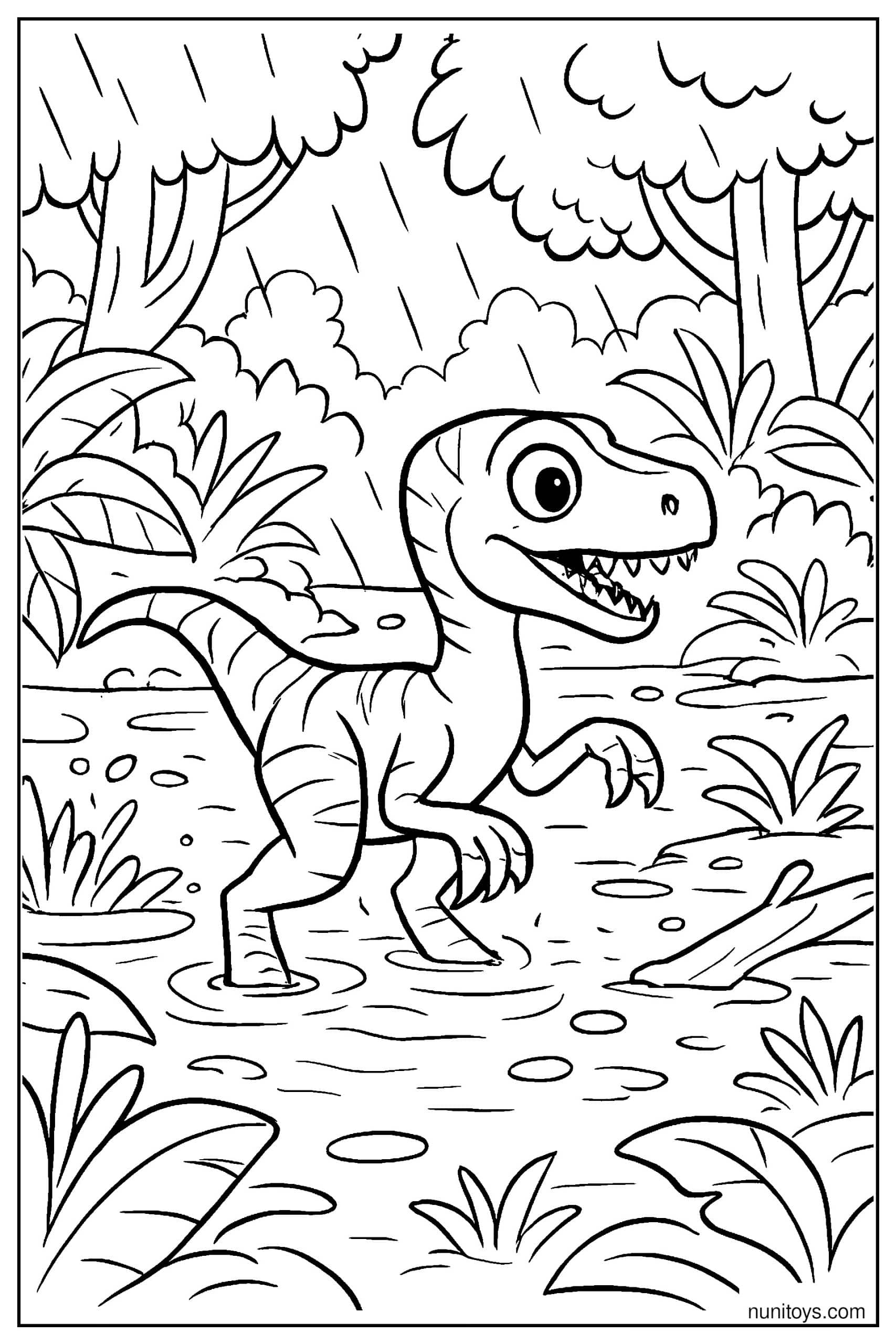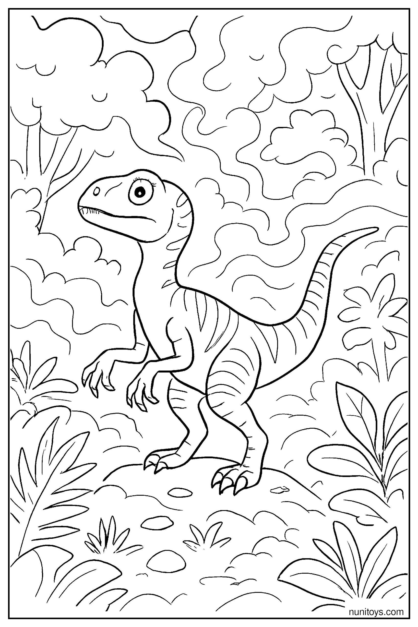 Coloring Velociraptor pages helps develop fine motor skills, improve concentration, and stimulate imagination. Many designs include prehistoric environments such as jungles, plains, and volcanic landscapes, adding depth and storytelling to each coloring experience.
