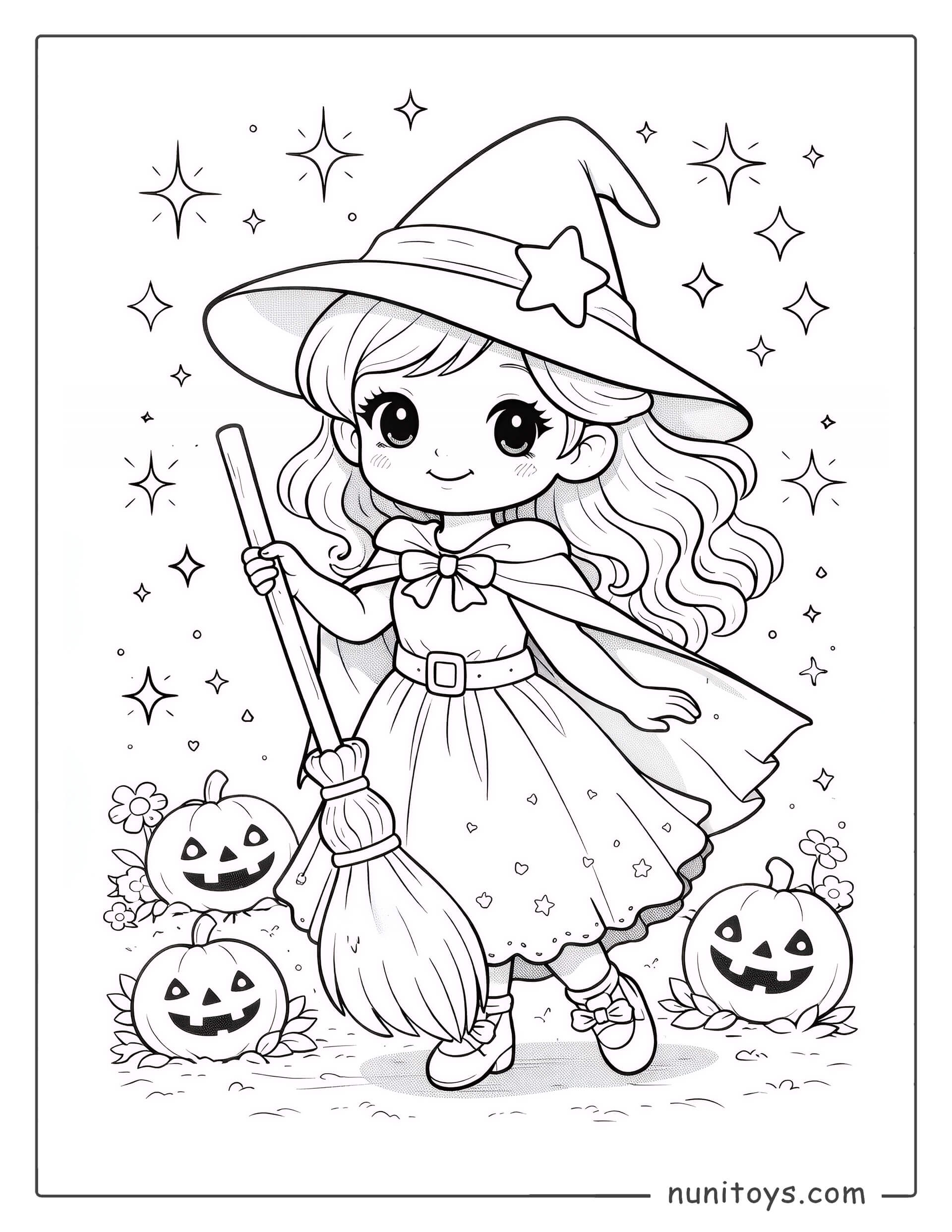 Brujita adorable de Halloween con calabazas para colorear