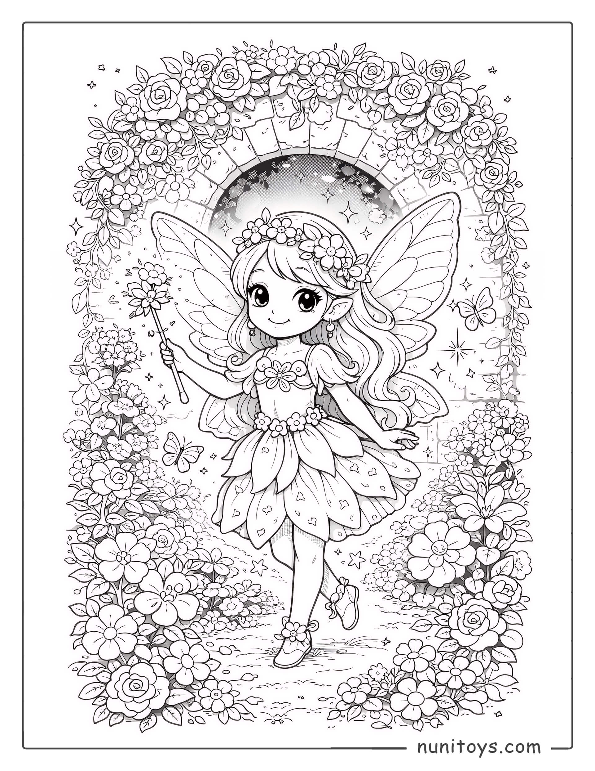 Página para colorear de hada mágica en un jardín de flores