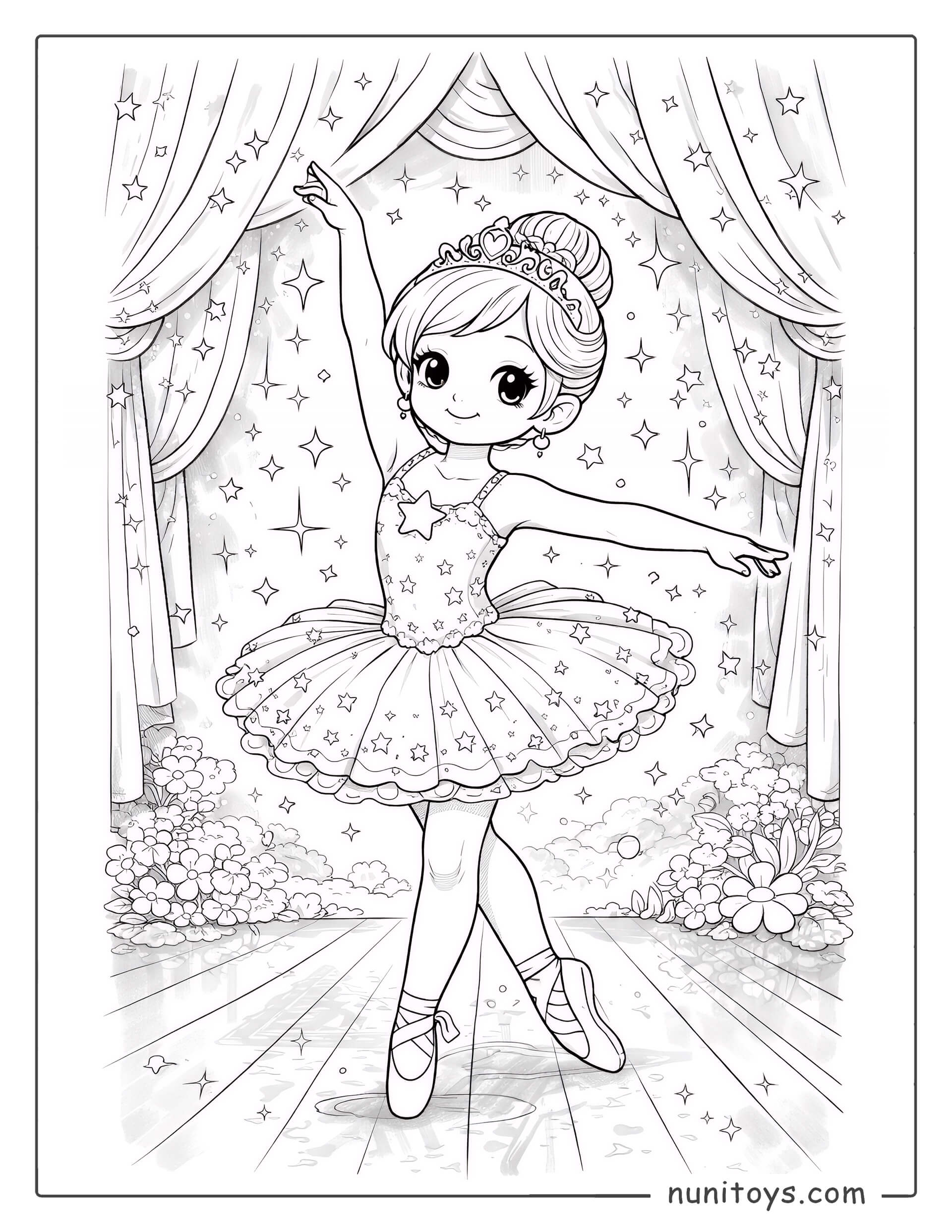 Página para colorear de bailarina clásica en el escenario