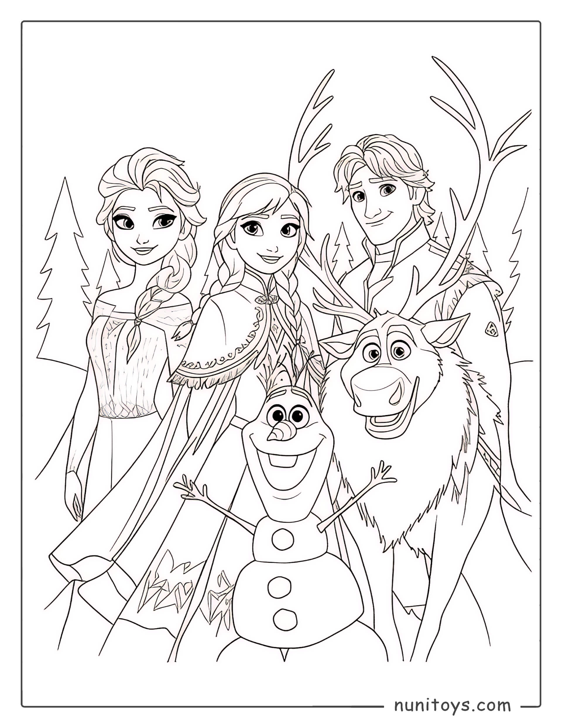 Coloriage d’Elsa, Anna, Kristoff, Sven et Olaf réunis dans une forêt hivernale