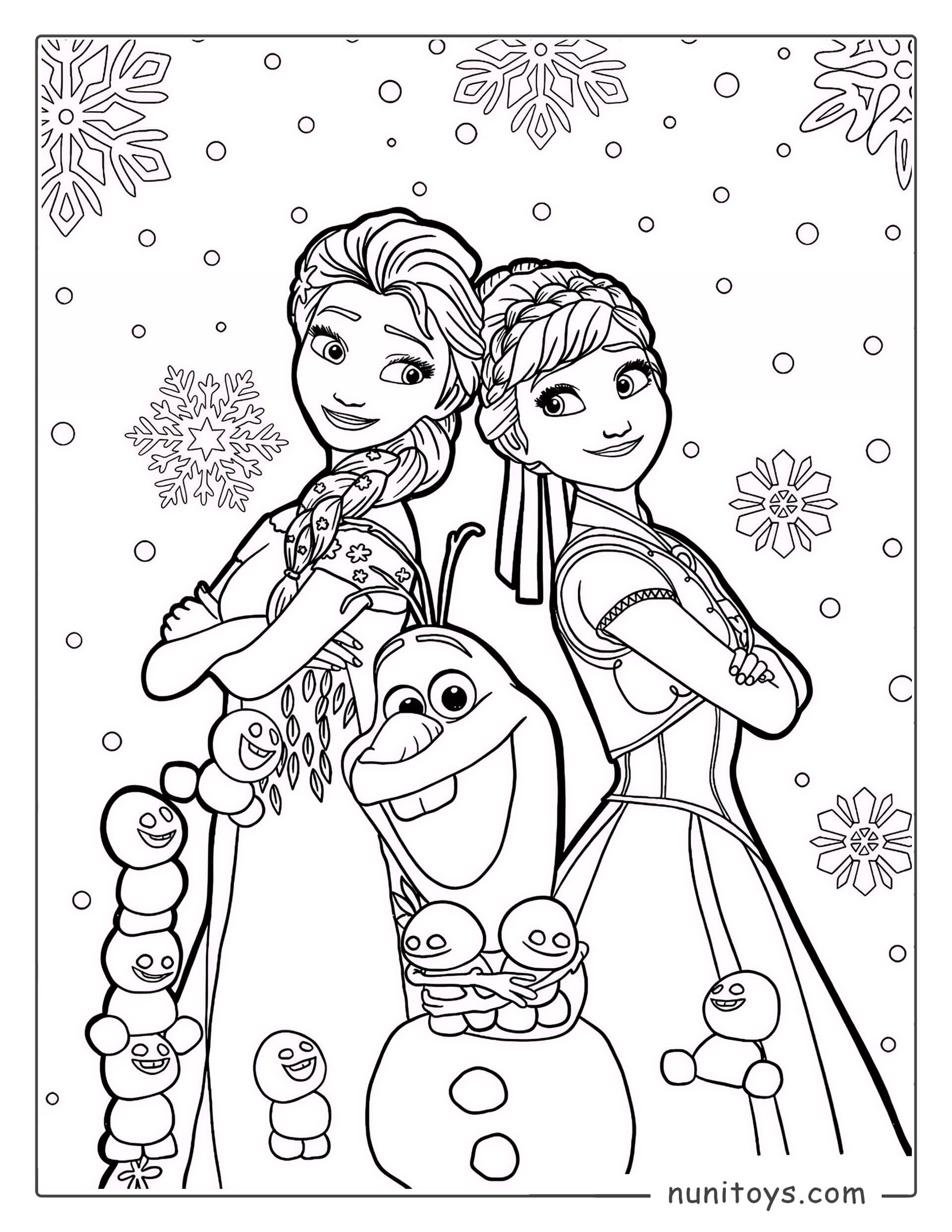 Coloriage d’Elsa et Anna debout pendant qu’Olaf sourit