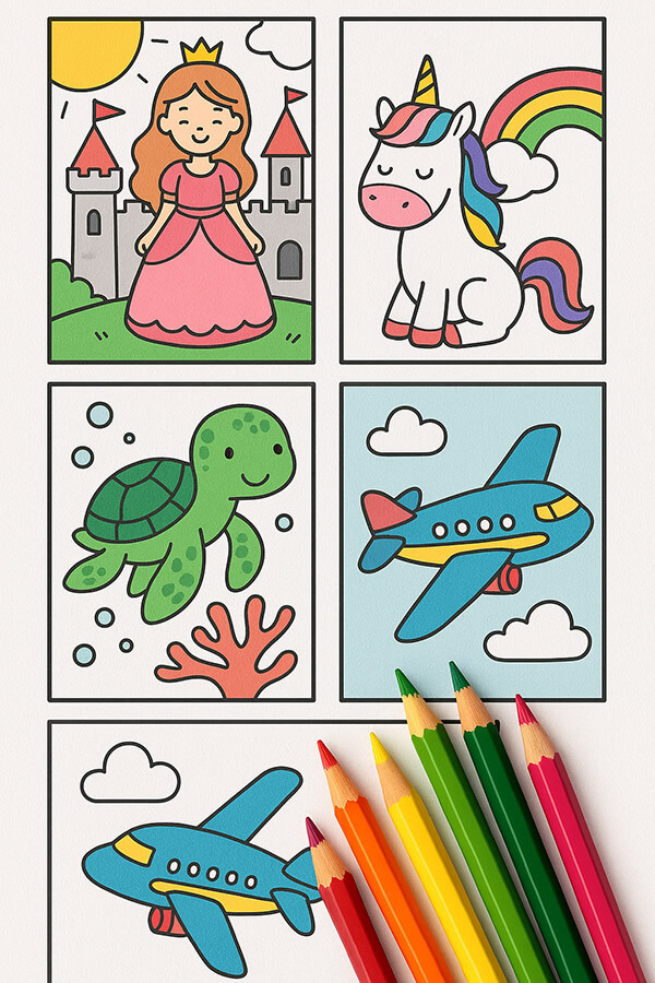 שלבו דפי צביעה של טבע, חיות, תחבורה, חלל ודמויות מצוירות מוכרות כדי לשמור על עניין.