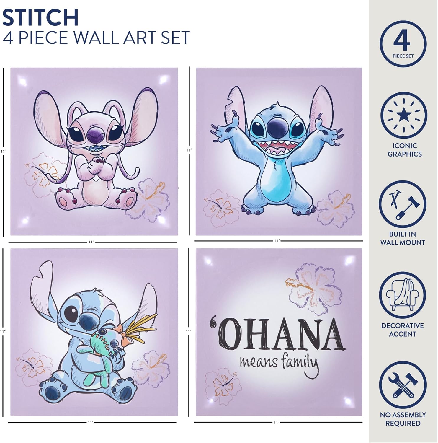 Crafted with lightweight canvas materials, these wall art pieces are easy to hang and can be arranged together or separately to match your room layout. Built-in hooks allow quick installation with no complex setup required. The playful designs, combined with the iconic “Ohana means family” message, add charm and emotional warmth to the room.